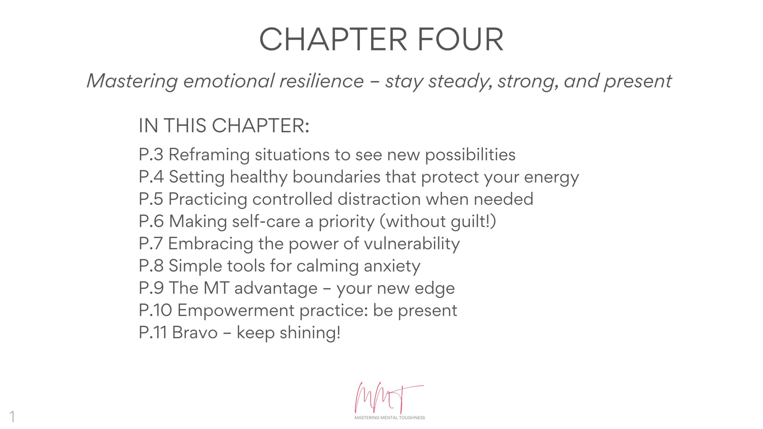 In this chapter you’ll deepen your resilience by learning how to manage challenges with clarity and calm. From reframing setbacks to setting boundaries and practicing vulnerability, you’ll expand your inner strength.